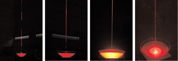 point. During that trajectory of light the liquid going from a dark to a bright red, looks like a kind of heart or lung which is taking life again after all these fatal moments. Opposite the installation some seats are set to accomodate the visitor. Thus this one can remain long minutes in contemplation, listening, waiting for another fatal moment. The cycle of the music is around 20 minutes. The visitor can enter and leave whenever he wants. |