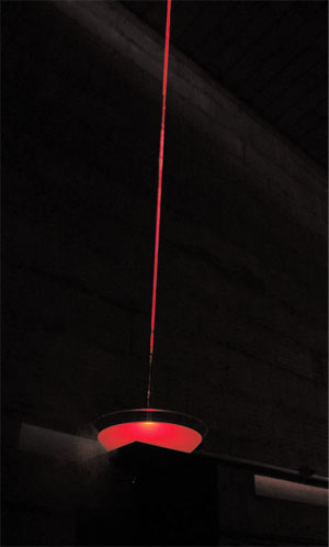 the very laser beam of the light. The whole set up is only lit by the diffusion of the light of the beam within the liquid. Some of light vapors seem to rise from the basin and glittered at the meeting of the beam. Via a multipoint system of diffusion, a sound environment similar to the one of a wet cave, made up with the echo of falls and flows of the water drops fills up the room. At some moments, more musical, dark or luminous sequences, crossed by breaths, come up with the silence revealed by the rare sound environment. Lastly, at unforeseeable moments, the fall of the drop starts a singular sound event, of strong resonance, of which escapes sometimes bits of texts borrowed from the poets. |